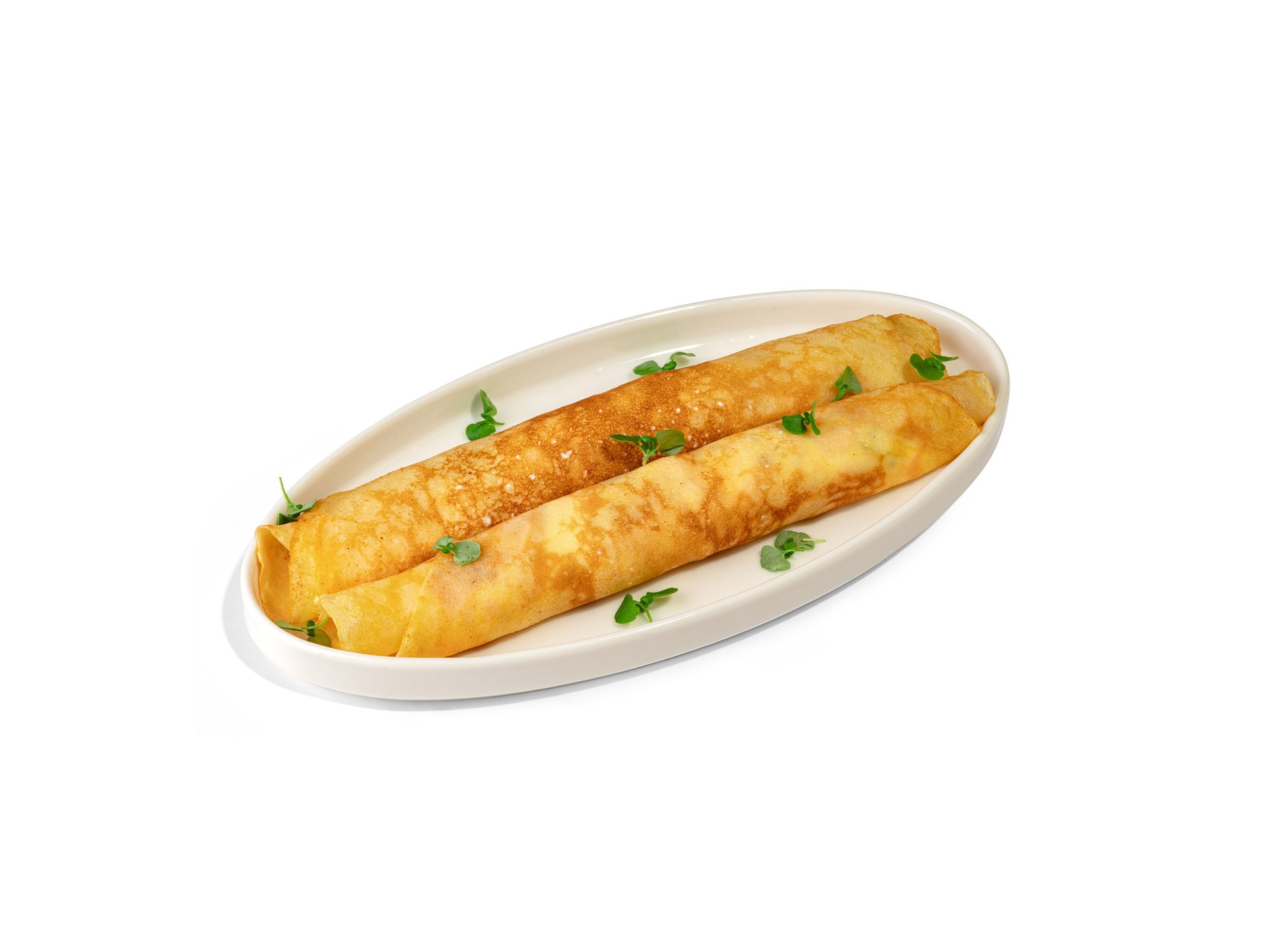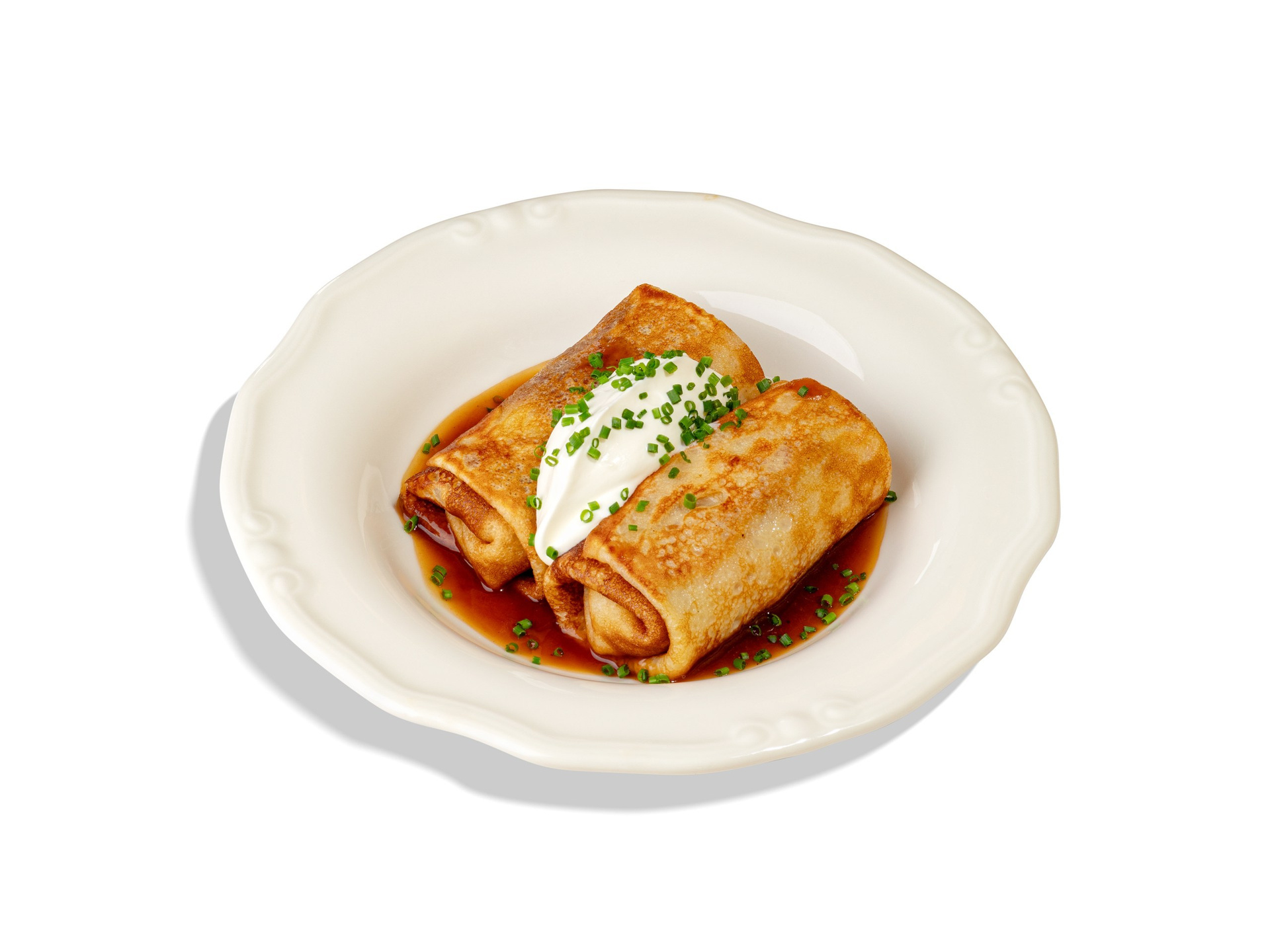 БЛИНЫ С МЯСОМ — 750Р. Блины с хрустящей корочкой с начинкой из фарша говядины, репчатого лука и паприки. Подаются на соусе демиглас и украшаются сметаной.