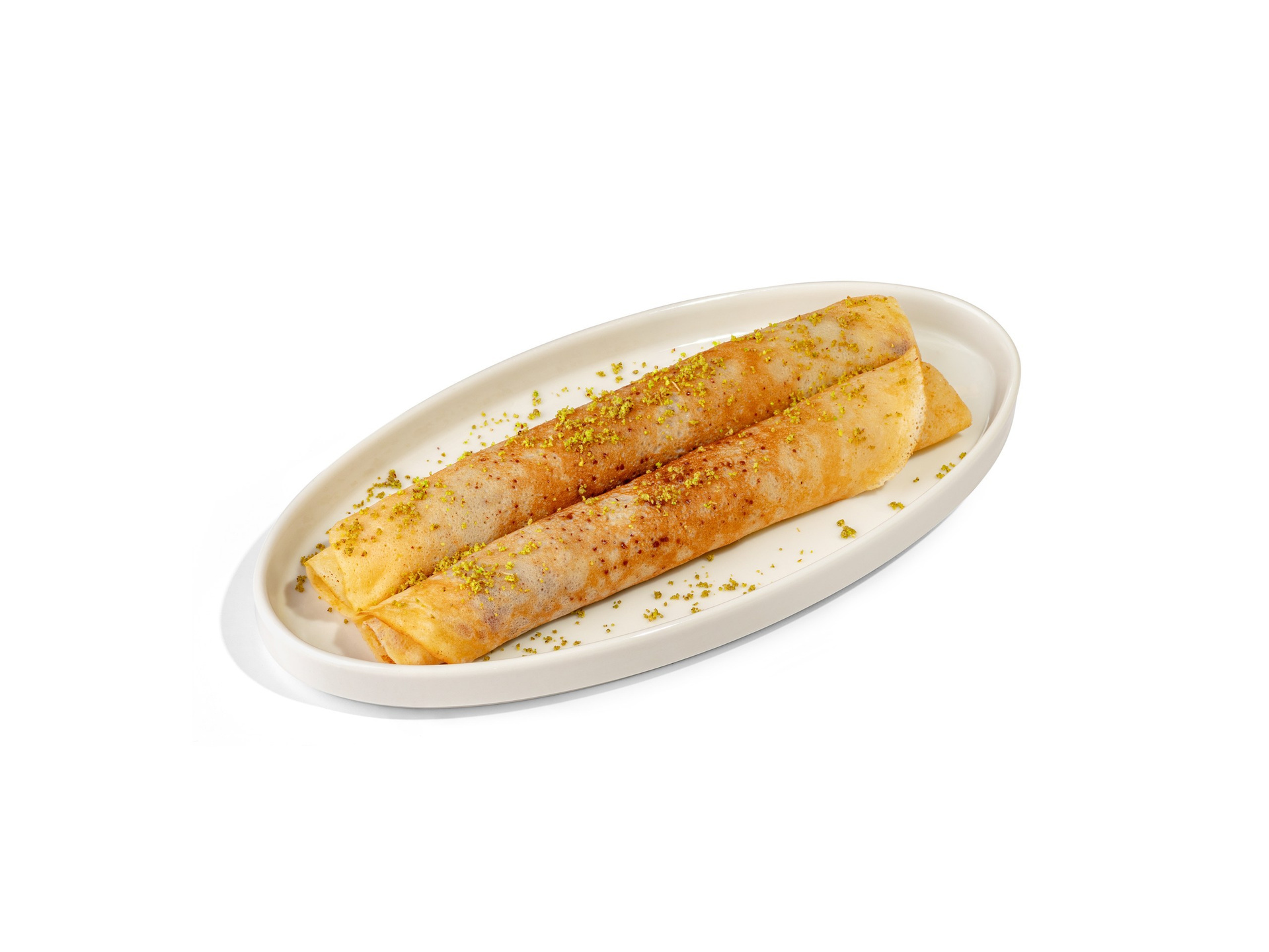 БЛИНЫ С НУТЕЛЛОЙ И ФИСТАШКОЙ — 850Р. Блины с начинкой из шоколадно - ореховой пасты и хрустящего теста катаифи. Украшаются молотой фисташкой.