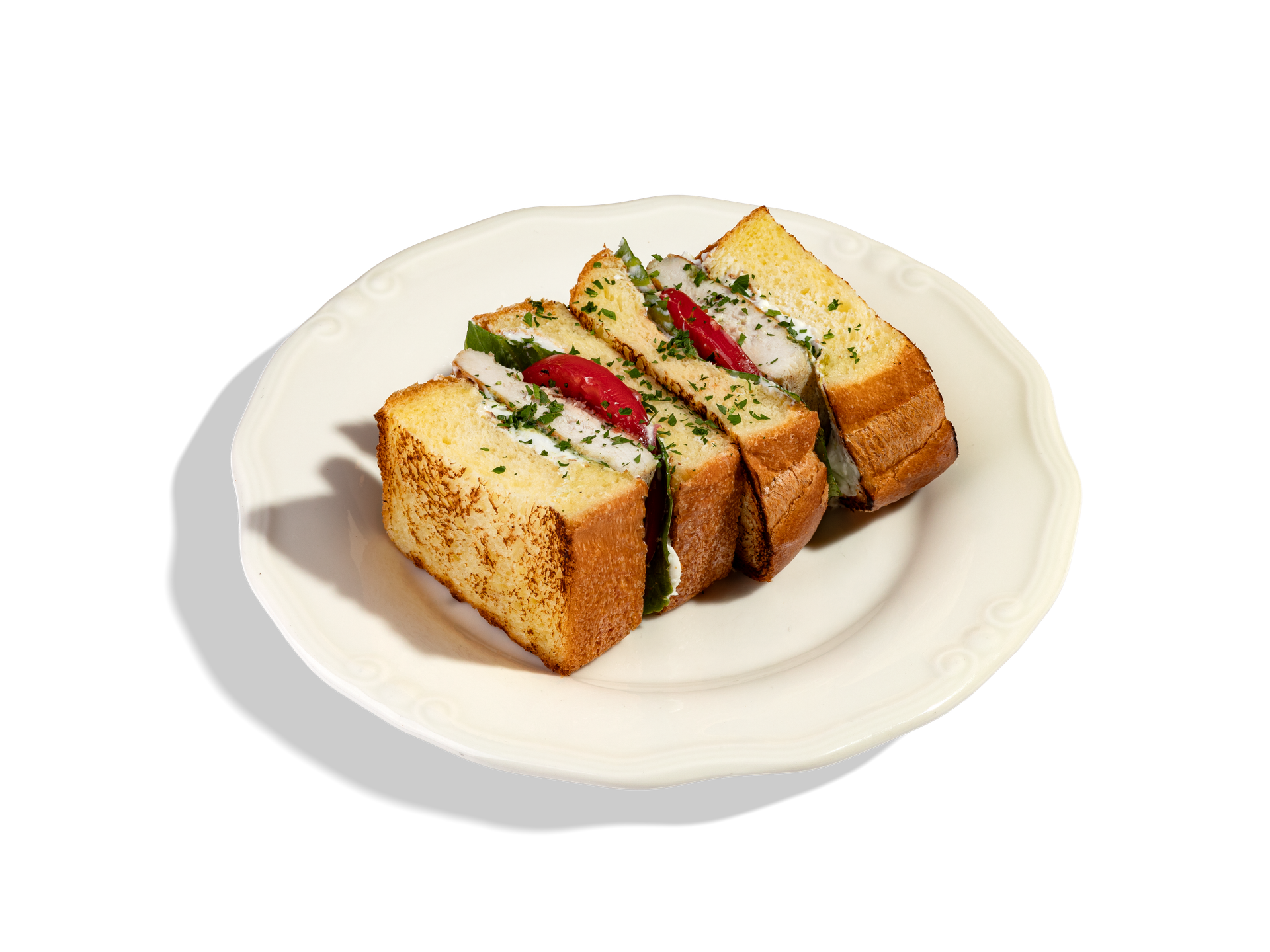 СЭНДВИЧ С ЦЫПЛЕНКОМ, СОУСОМ ПЕСТО И ТОМАТАМИ — 750Р. Воздушный тост бриошь, куриное филе, соус песто, салат романо, взбитый сыр фета, томаты, петрушка.