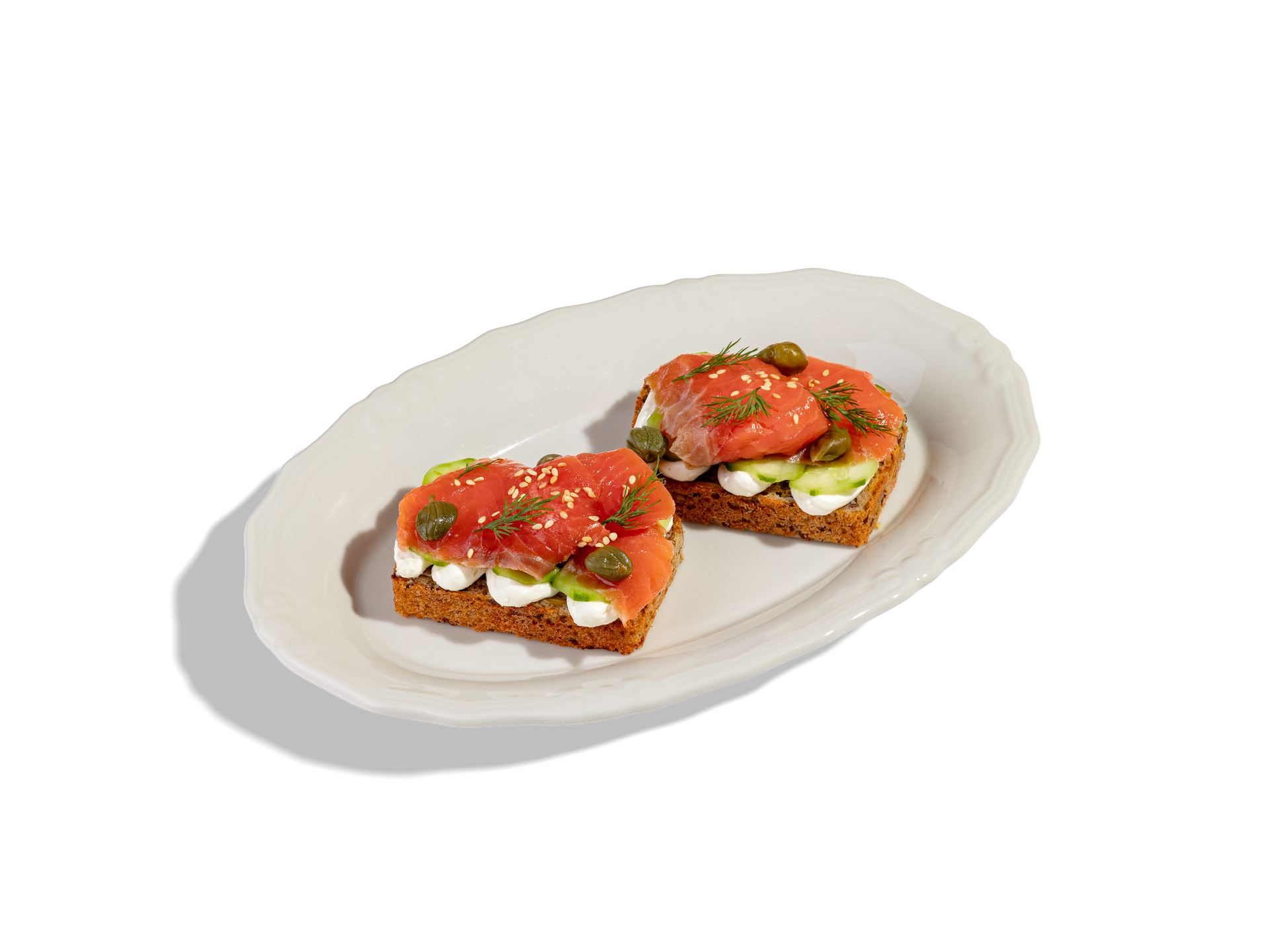 ТОСТ С ЛОСОСЕМ И СЫРОМ ФЕТА (БЕЗГЛЮТЕНОВЫЙ ХЛЕБ) — 750Р. На безглютеновом хлебе лосось с/с, огурцы, взбитый сыр фета, каперсы, украшается кунжутом и укропом.