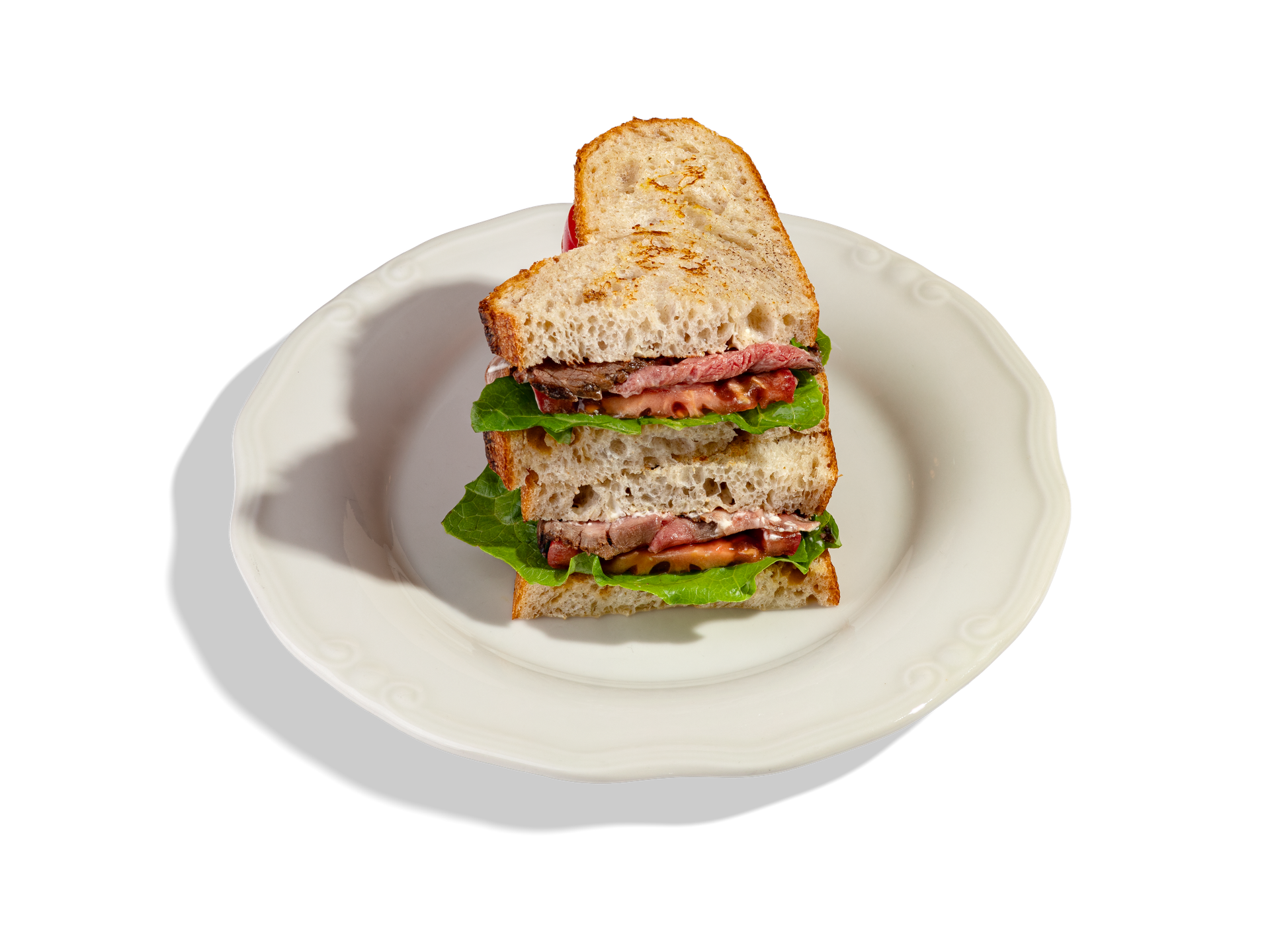 СЭНДВИЧ С РОСТБИФОМ И ТРЮФЕЛЬНЫМ МАСЛОМ — 850Р. Хлеб Тартин собственного производства, с ростбифом, свежими томатами, салатом романо, соусом тонато и медово - горчичной заправкой.