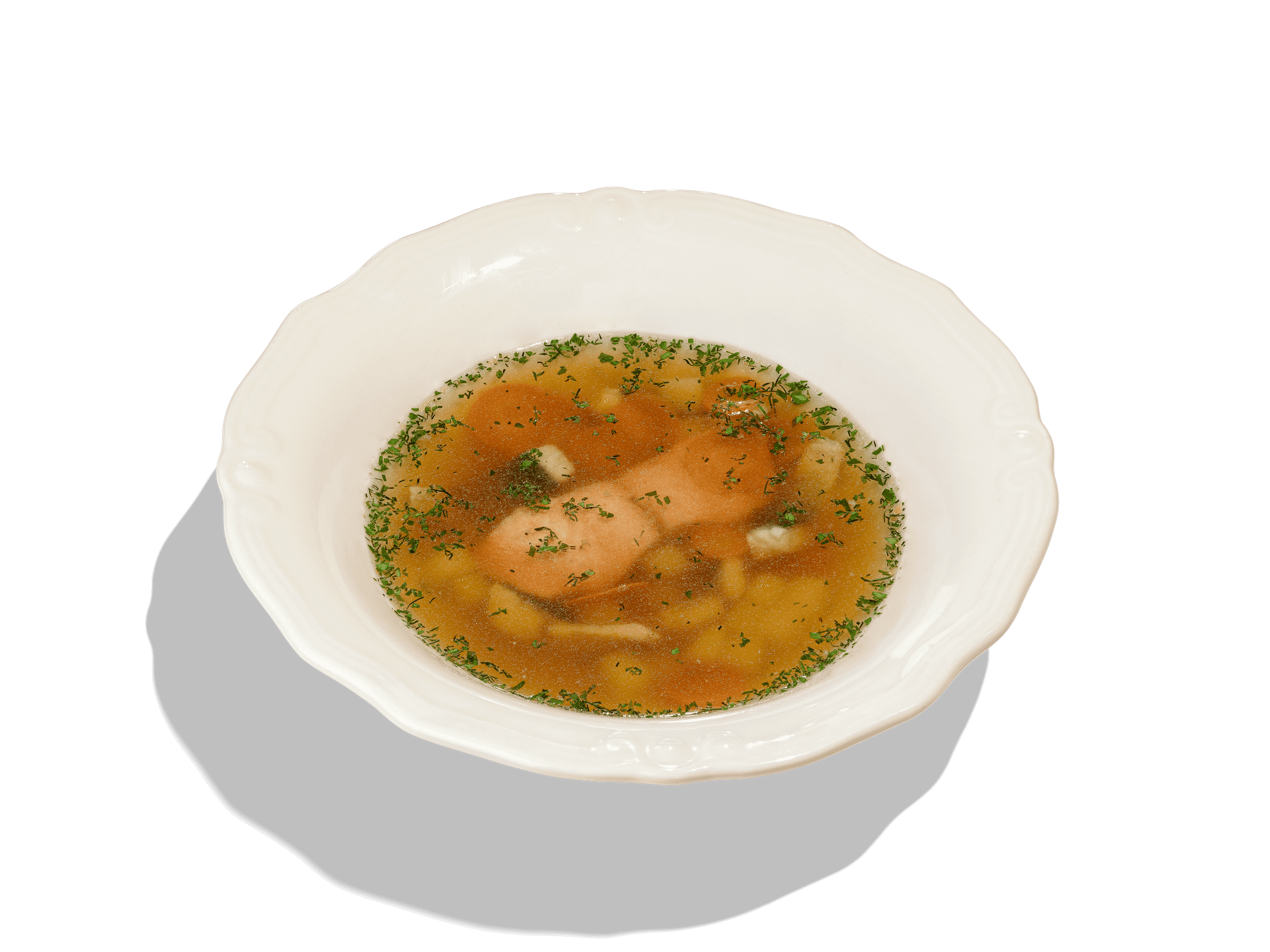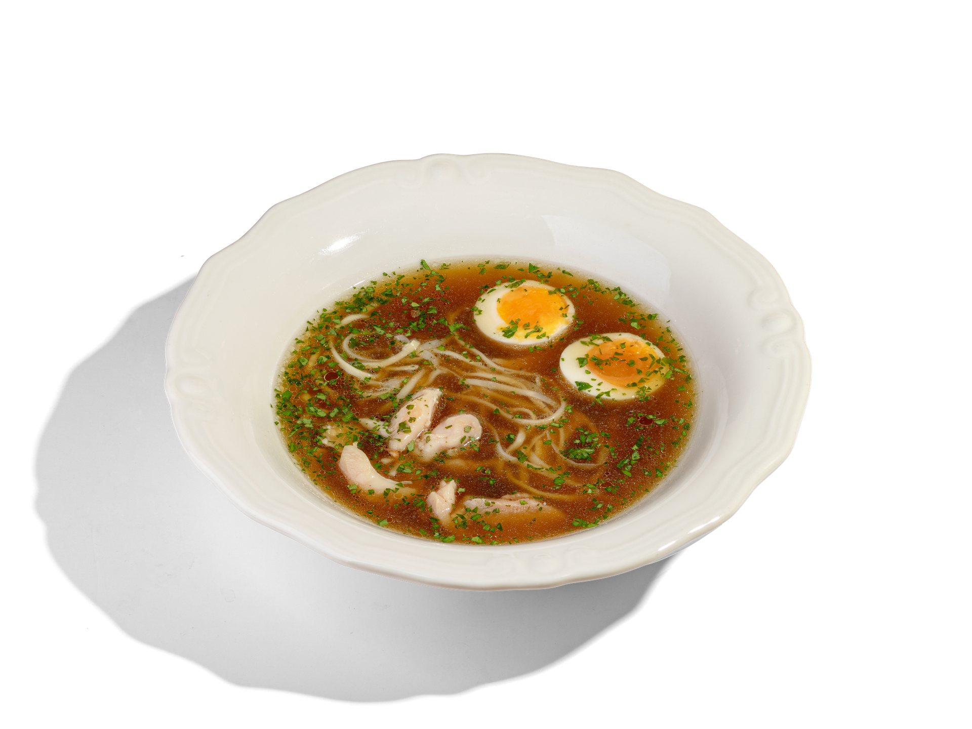ДОМАШНЯЯ ЛАПША 550₽. Классическая лапша на курином бульоне с куриным филе, яичной лапшой и яйцом. Украшается свежими листьями петрушки.